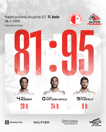 Třetí čtvrtinu jsme vyhráli 26:18 a ve druhém poločase jsme byli aktivnějším týmem. Ve druhé dvacetiminutovce jsme Pardubice přestříleli 52:42, ale ztráta z úvodu byla příliš velká. Nejlepším střelcem Slavie byl opět Dale Bonner, který zaznamenal 29 bodů a přidal i 8 doskoků. Jelani Watson-Gayle přidal 24 bodů, Radek Pumprla přispěl 9 body.